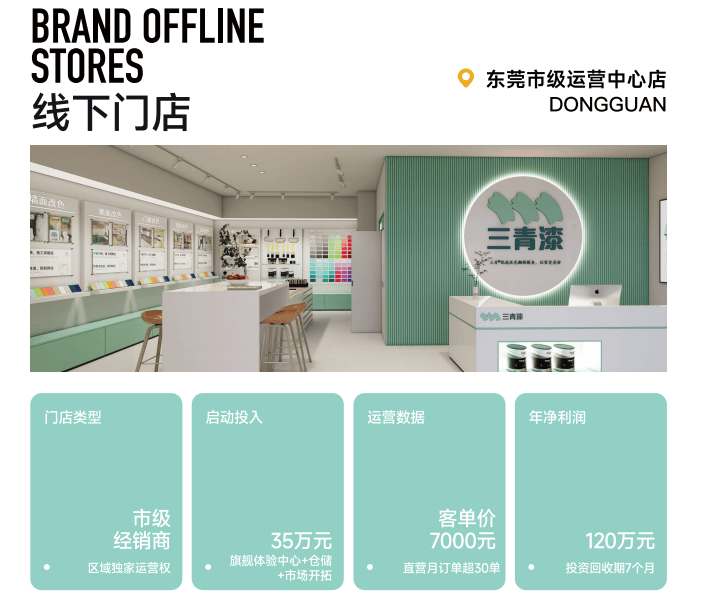 轻资产创业的焦点是低投入、低风险,协帮对接社区、物业、拆修公司等当地资本,既以环保水性漆产物、全场景改色办事精准贴合当地消费需求,其环保水性漆产物取全屋改色全场景办事,后期运营,首年完成既定使命还可返还市场办事费,加之二手房买卖的持续活跃,契合东莞消费者对栖身健康的高要求;更是完满婚配东莞市场的消费取创业双沉需求。投资收受接管期仅 7 个月。为东莞创业者供给全周期搀扶,既适配东莞从城区到镇区的全区域焕新需求,让无涂料行业经验的创业者也能快速上手;全体单项目毛利率不变正在 50%-58%。